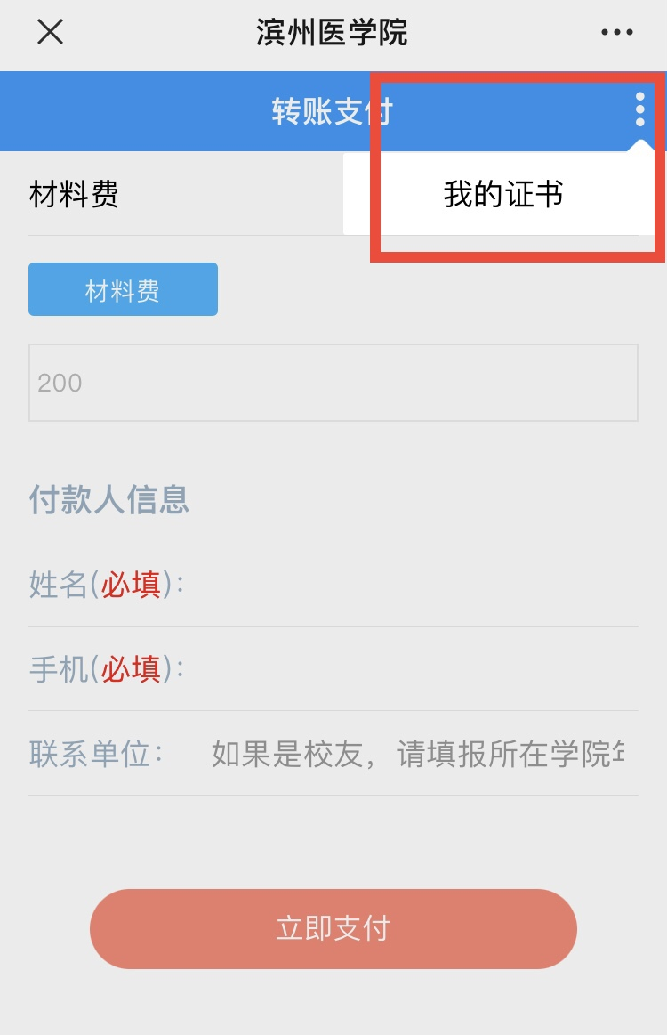 材料费200元/份,请扫描下方二维码支付,跳转到支付界面后,“姓名”请输入公司名称,点击“立即支付”即可完成付款。再次扫描二维码,点击右上角“