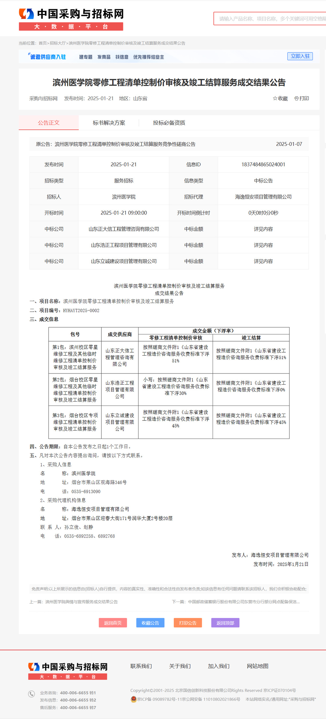 滨州医学院零修工程清单控制价审核及竣工结算服务成交结果公告